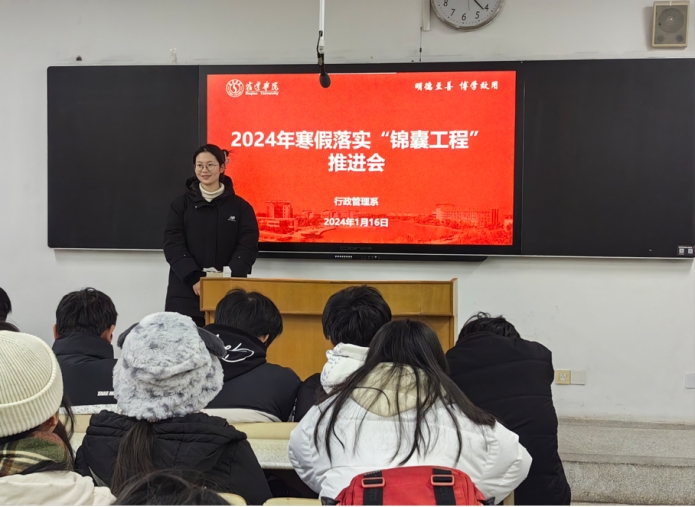 为落实落细经济管理学院“锦囊工程”项目,行管系教师组织学生举办了以“寒假‘锦囊工程’任务安排”为主题的班会活动,参与本次活动的有班主任韩雪老师、行管系全体教师以及23行管的全体同学。