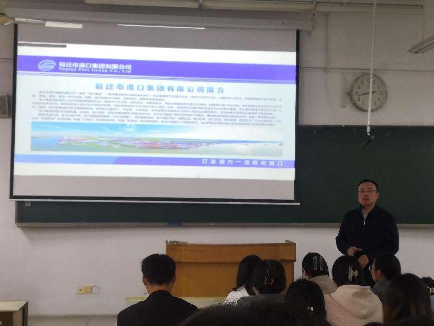 为进一步深化产教融合协同育人,增强学生对行业深入了解,提高应用型人才培养质量和就业竞争力,4月10日,我院邀请港口发展公司党委副书记、总经理、集团生产运营部部长、港发供应链总经理、宿迁港铁路公司总经理何好先生走进《国际物流》课堂,何总以其丰富的物流从业经验和独到的行业见解,为21级物流专业学生带来了物流行业发展的深度剖析,与校内授课教师吴英晶教授共同完成课程教学工作,促进学生理论知识与实践水平相辅相成、同步提升。