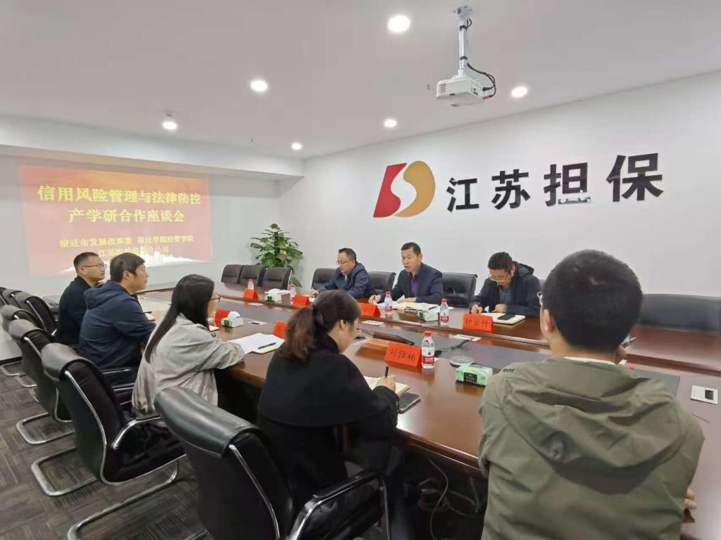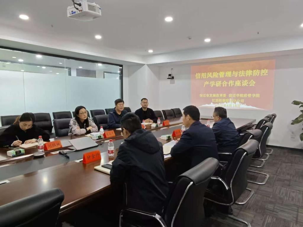 2024年11月13日下午14:30,经济管理学院法律系与江苏担保宿迁分公司、宿迁市发改委举行信用风险管理与法律防控产学研合作座谈会。江苏省信用融资担保有限公司宿迁分公司负责人、宿迁市发改委社会信用处处长刘筱青参加活动。