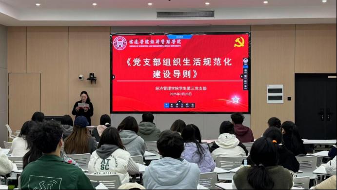 活动在庄严的国歌声中拉开序幕。支部书记李严严老师首先带领全体党员集中观看了《习近平在参加江苏代表团审议时强调经济大省要挑大梁为全国发展大局作贡献》专题视频。通过影像资料,师生们直观感受到习近平总书记对江苏发展的殷切期望,进一步明确了作为经济管理学院学子的时代责任。