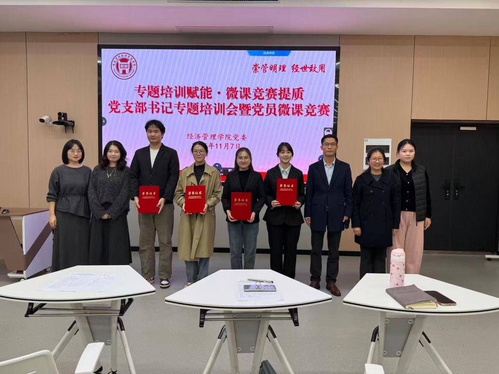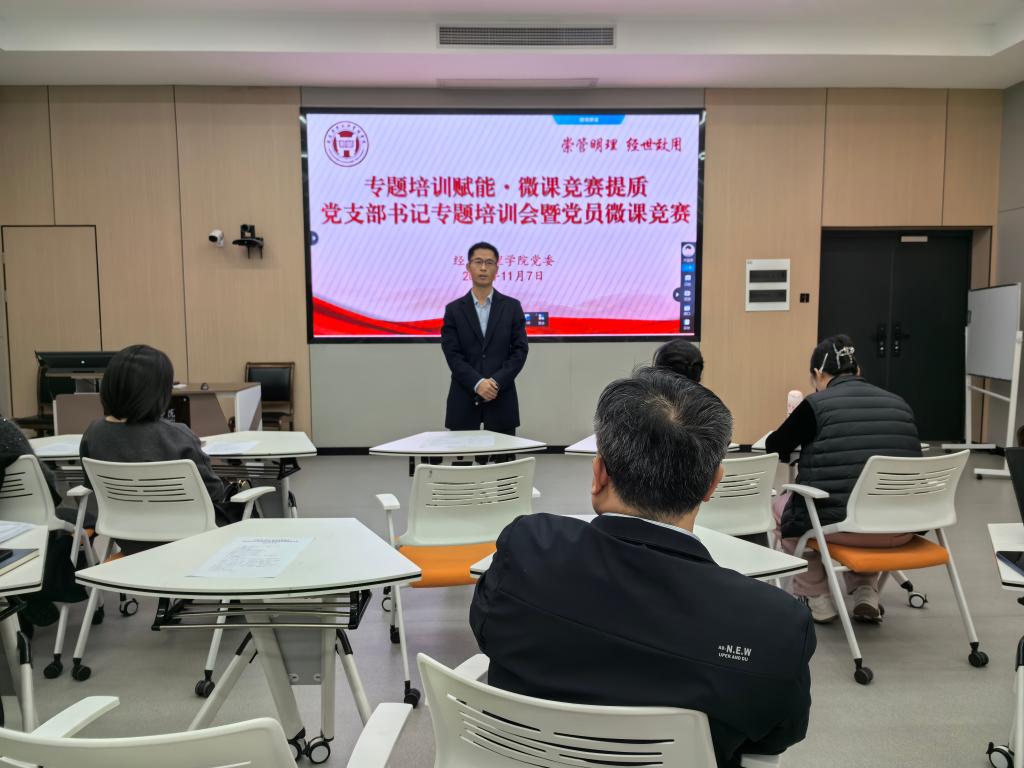 为深入学习贯彻党中央关于加强基层党组织建设的重要精神,切实提升党支部书记履职能力,创新党员教育形式,2025年11月7日下午,经济管理学院党委在1号楼四阶教室成功举办“专题培训赋能·微课竞赛提质”党支部书记专题培训会暨党员微课竞赛。学院党委书记邓平安、党委副书记沈姣、马克思主义学院教师刘春蕾、裴婉婷、魏雅珍出席活动,学院组织员、全体党支部书记及师生党员代表参加。