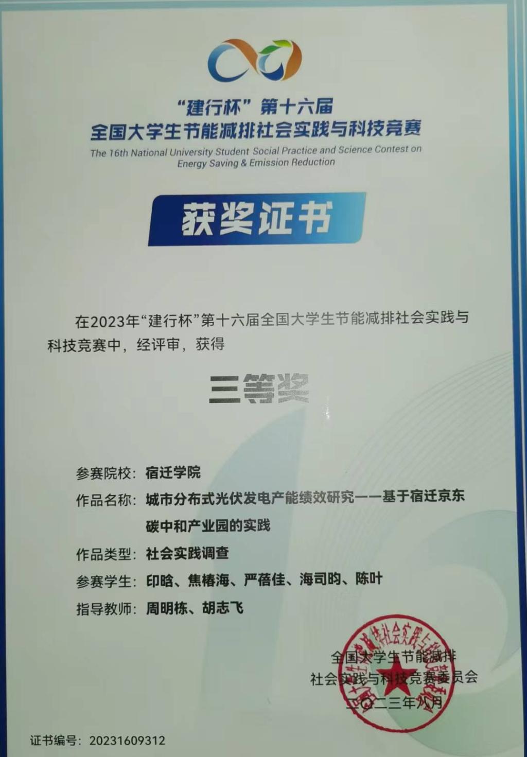由教育部高等学校能源动力类专业教学指导委员会指导,教育部高等教育司主办,东南大学承办的2023年“建行杯”第十六届全国大学生节能减排社会实践与科技竞赛决赛成功举办。由我校经济管理学院教师周明栋指导,印晗同学主持的《城市分布式光伏发电产能绩效研究-基于宿迁京东碳中和产业园的实践》项目,获得2023年全国大学生节能减排社会实践与科技竞赛国赛三等奖。