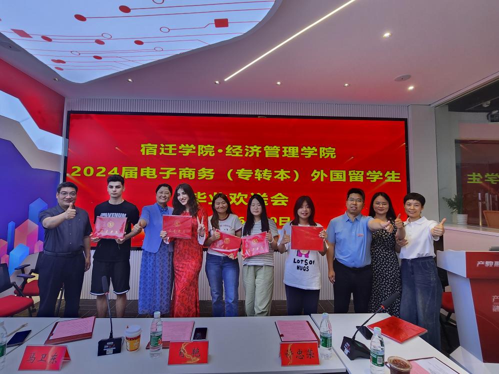 6月20日下午,宿迁学院经济管理学院为2024届电子商务(专转本)外国留学生举行了一场别开生面的毕业欢送会,旨在表达对毕业生们的深切祝福和殷切期望,同时为他们留下难忘的青春回忆。经济管理学院院长肖艳、副书记马卫东、副院长许忠荣,国际合作与交流处卢维诗、杨春燕出席活动,电子商务系主任胡长深主持。