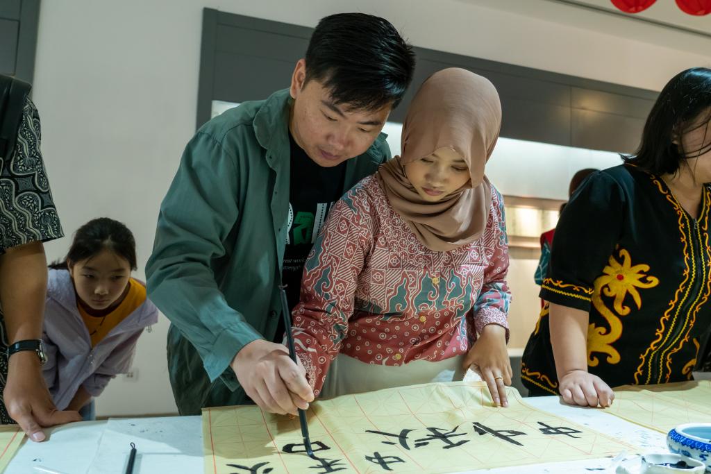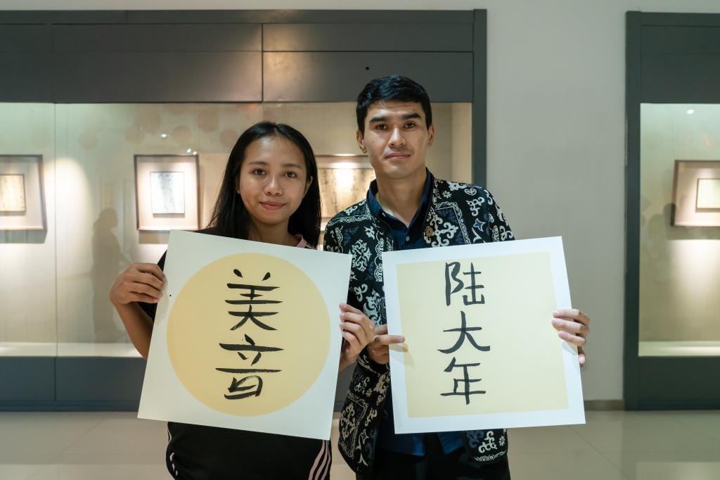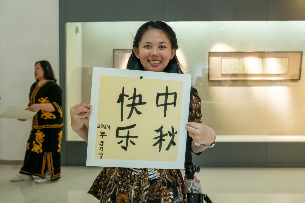 随后,学生们移步至博物馆二楼,参观了宿迁市青年书法家协会主席赵振老师的个人书法展。在书法展的熏陶下,学生们对书法产生了浓厚的兴趣,纷纷表示希望亲身体验书法的魅力。在赵振老师的亲自指导下,学生们拿起毛笔,尝试书写“中秋”二字。虽然笔触略显生疏,但他们的眼神中却充满了对书法艺术的热爱与追求。这场跨越文化与语言的书法体验,不仅让学生们学到了书法技艺,更让他们深刻体会到了中国书法的韵味与内涵。