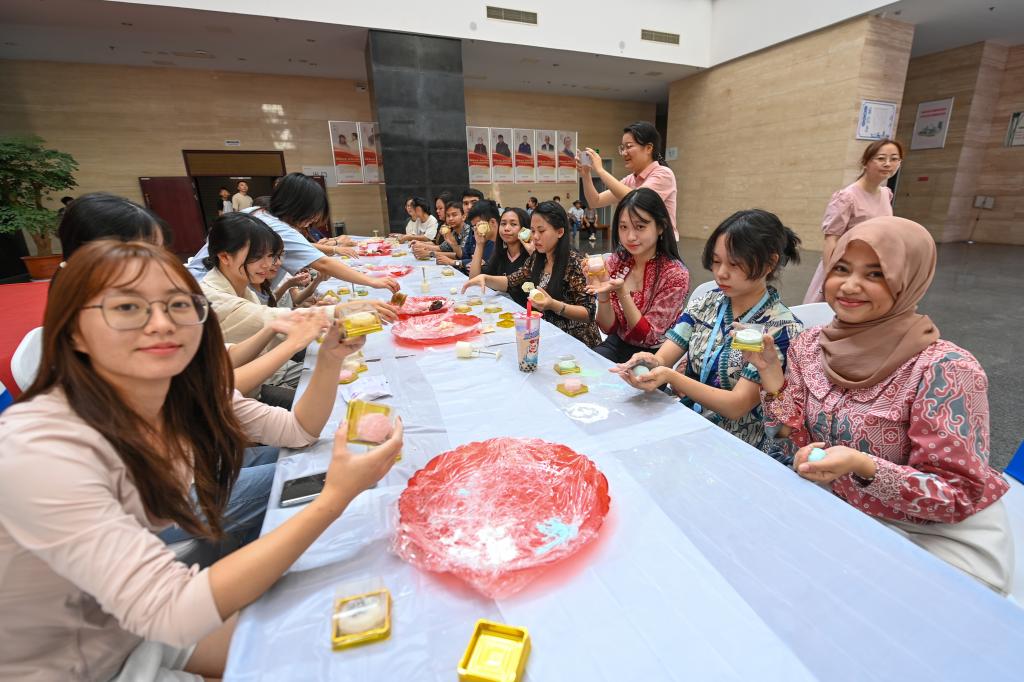 活动现场,学生们在宿迁博物馆一楼亲手制作月饼。在专业老师的悉心指导下,他们亲手揉面、包馅、压膜,每一道工序都充满了节日的仪式感。月饼不仅承载着美味,更传递着对中国传统文化的深深敬意与祝福。中外学子在合作中增进了友谊,共同体验了传统节日的温馨与快乐。