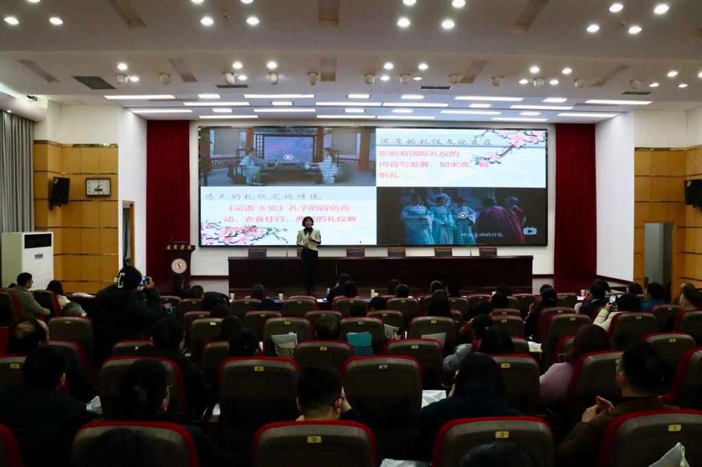 杜教授立足中华传统礼仪文化,结合《周礼》《礼记》等典籍,剖析“敬人敬己”的礼仪内核,强调教师需以“内外兼修”践行育人使命:外在层面,通过职业着装规范(如女性淡妆得体、男性仪容清爽)、站姿“九点靠墙法”、坐姿“横平竖直”等实操技巧,塑造端庄得体的课堂形象;内在层面,以《教师法》为指引,倡导教师以谦逊修养、文化积淀和道德自觉,潜移默化引导学生价值观。