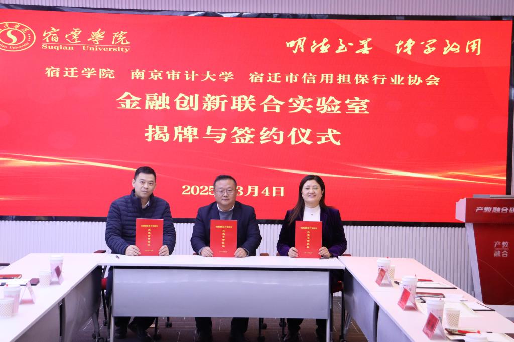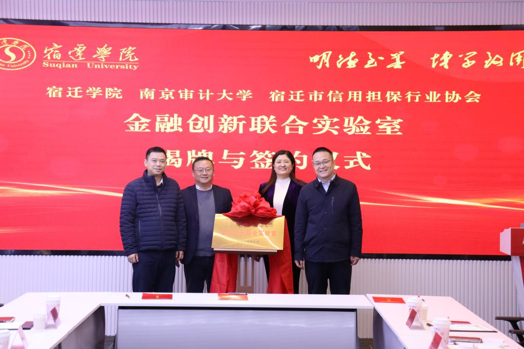 3 月 4 日下午,宿迁学院、南京审计大学与宿迁市信用担保行业协会于京东二楼会议室联合举办 “金融创新联合实验室” 揭牌仪式暨交流座谈会。经济管理学院院长肖艳、宿迁市信用担保行业协会会长宋允智出席会议并致辞,南京审计大学金融学院副书记、副院长刘骅,经济管理学院副院长陈维涛及三方相关人员参会,会议由经济管理学院副院长姜丽丽主持。