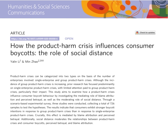 近日,我院李亚林教授团队,以宿迁学院为第一完成单位,在Nature旗下唯一人文社科期刊Humanities& Social Sciences Communications发表了题为“How the product-harm crisis influences consumer boycotts: the role of social distance”的论文。该论文通过三个实验,分别选择不同的实验对象和实验场景,通过分析责备归因和感知背叛的中介作用,以及社交距离的调节作用,探讨了产品伤害危机影响消费者抵制的内在机制。该研究对进一步理解产品伤害危机的影响提供了理论指导,并对如何治理产品伤害危机提出了建议。