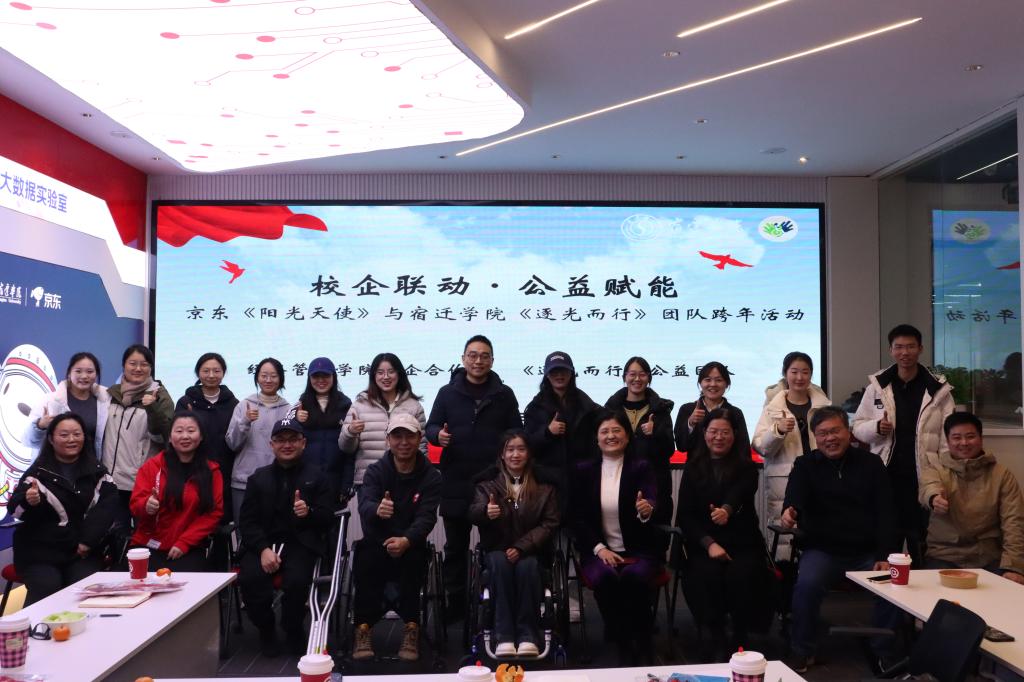 12月30日下午,宿迁学院经济管理学院、《逐光而行》公益团队与京东集团校企合作部及《阳光天使》团队联合开展“校企联动·公益赋能”主题活动。活动旨在深化校企合作,共同探索新业态下残疾人就业支持模式。