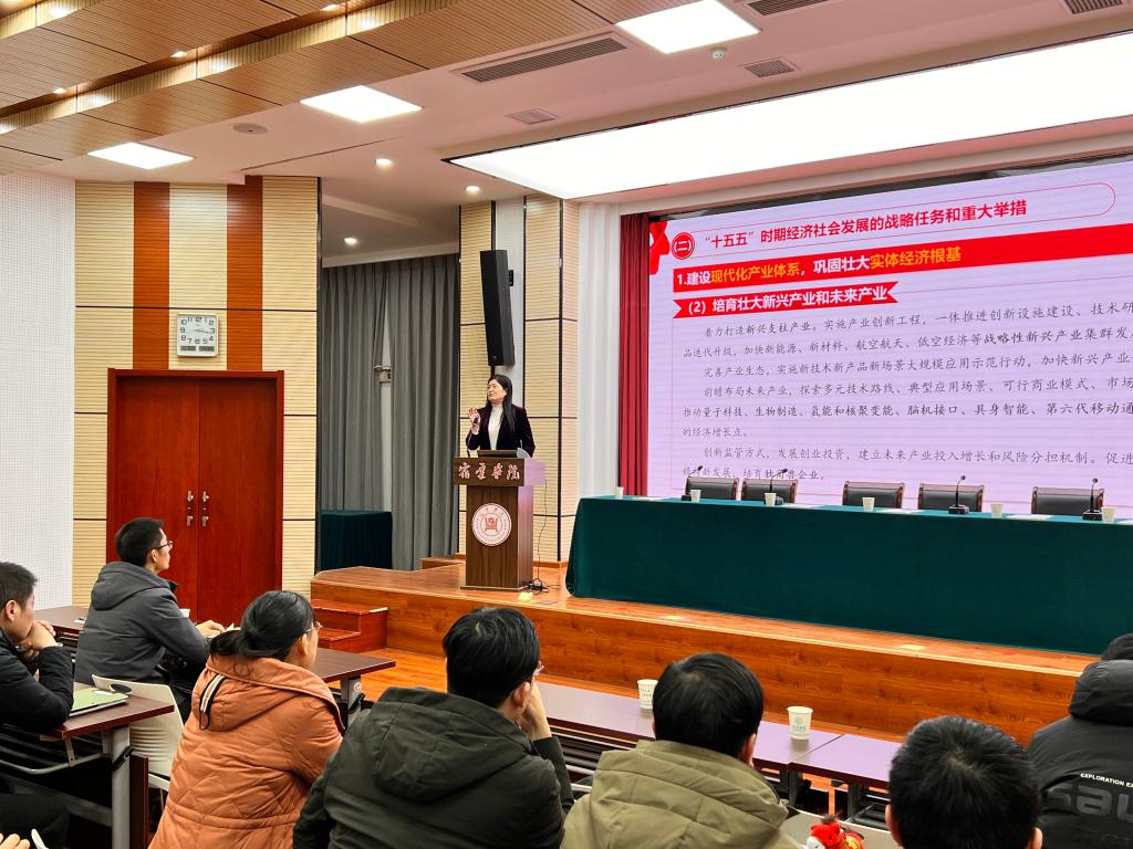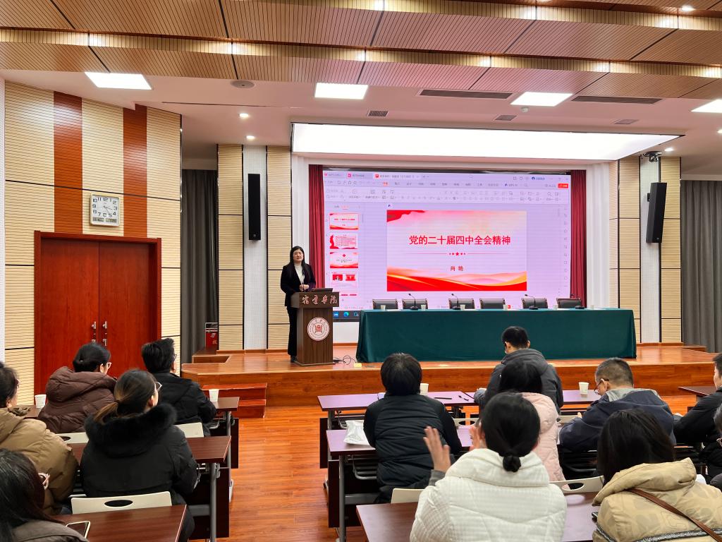 肖艳院长围绕全会的重大意义;“十五五”时期在基本实现社会主义现代化进程中的重要地位;“十五五”时期经济社会发展的指导思想与重大原则、主要目标与战略举措及根本保证五大方面对全会精神进行深度解读,重点阐释了如何将全会精神转化为学科专业建设、师资队伍提质、产学研深度融合及服务地方经济发展的具体行动路径,引导全体教师锚定使命定位、明晰实践方向。整场报告主题鲜明、脉络清晰、重点突出、论述深刻,对于全院教职工全面准确学习领会党的二十届四中全会精神具有重要的指导作用。