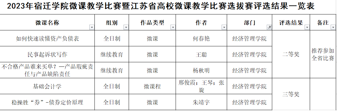 根据《关于举办2023年江苏省高校微课教学比赛的通知》和《关于举办2023年宿迁学院微课教学比赛暨江苏省高校微课教学比赛选拔赛的通知》相关要求,我校开展了微课教学比赛评选工作。经专家组评审,经济管理学院获得校级二等奖3项、三等奖2项,其中获得校级二等奖的作品被推荐参加全省比赛。
