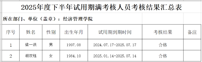 经试用期满考核人员公开书面述职,经济管理学院教职工试用期满考核工作小组对各位被考核人员的试用期工作情况进行综合评议,现将评议结果公示如下(按入职时间先后排序):