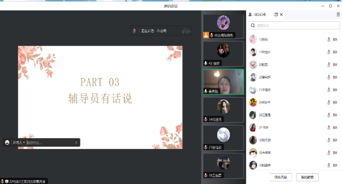本次会议共五项议程,第一项班主任王晓峰老师首先从三个方面“毕业生”、“新来的”、“缘分”寻找与同学们的共同点,进一步拉近与学生间的关系。随后重点阐述了对电子商务专业的理解,帮助学生加深对本专业的认识与了解。第二项班助分享,班助作为新生和老师之间的桥梁,起着重要的协调沟通作用。在新生未来的学习和生活中能够为同学们提供帮助并且做出一些思想引导。可以帮助大家更快、更好的适应大学的新生活。五位班助分别介绍了自己,以及各自负责的工作领域。随后重点传达了学校、学院的各项规章制度、纪律问题、英语四级的重要性、转团关系、校园活动以及校园生活等。第三项议程,辅导员余佳老师首先作了简单自我介绍以及向大家说明了辅导员的相关工作内容,随后重点从暑期防诈骗(国家反诈app,学费)和安全教育(夏季水边)进行宣传,用一些可爱的昵称,让新生放下对辅导员的恐惧,展示了辅导员的亲和力。最后,也向学生表明,有问题要及时找辅导员沟通,她一定会竭力解决。第四项议程:新生自我介绍,这一环节是老师和班助最为期待的,50位同学纷纷都开启摄像头在线与老师会面,各自介绍了自己家乡、性格、兴趣爱好以及对大学四年的憧憬。透过屏幕可以看出同学们对新学校、新生活的向往。第五项议程:新生自由提问,同学们分别从军训、宿舍、校园环境、电子商务专业课程、就业方向等方面提出疑问,辅导员、班主任和班助为学生们耐心解答。本次班会长达2小时,中途无一人退出,最终完美结束。