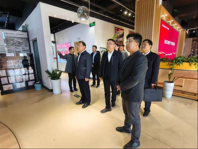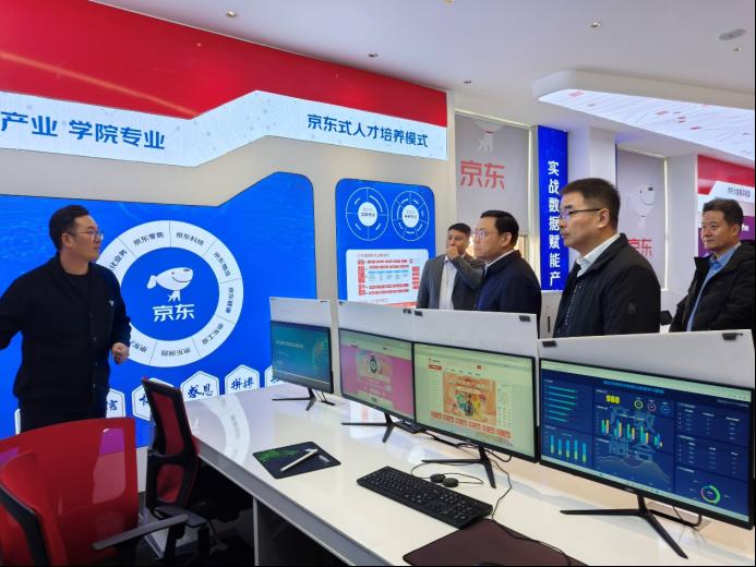 会议前,孙建昌校长一行参观了京东产教融合示范基地。经济管理学院许副院长忠荣介绍了京东现代产业学院的发展历程以及宿迁学院和京东在人才培养、科研产出等方面的合作成果。京东总经理袁晨皓展示了京东校园商城的运行机制以及京东开放给宿迁学院的特殊教育资源。艺术与传媒学院吕光教授介绍了我校在乡村振兴方面取得的阶段性成果。